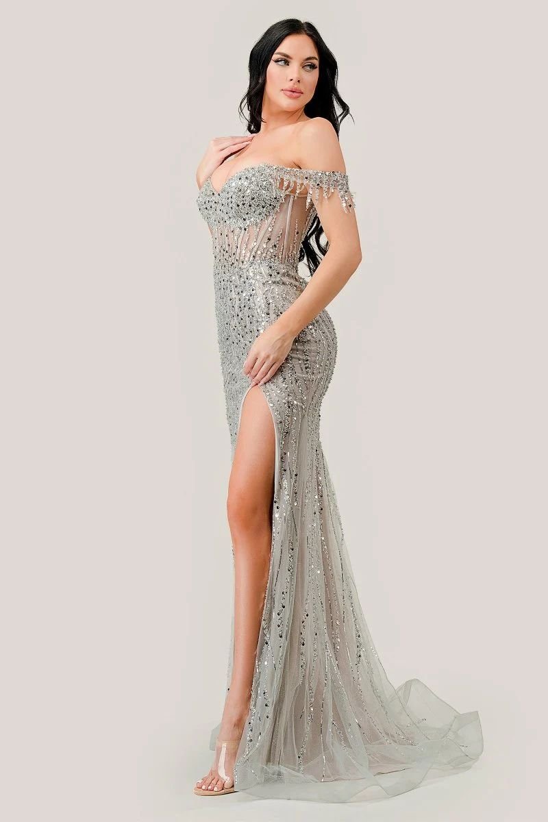 Das Abendkleid Eva ist ein elegantes Off-Shoulder-Glitzer-Abendkleid mit Schlitz, das die Figur traumhaft in Szene setzt. Das schulterfreie, herzförmige Oberteil mit feinen Fransen-Details und funkelnden Pailletten betont Dekolleté und Taille, während das semi-transparente Korsagen-Design einen modernen, sinnlichen Look schafft.